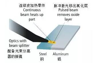 鋁材和鋼材不能使用常規(guī)方法進行焊接。然而,用激光技術(shù)能夠?qū)崿F(xiàn)固態(tài)搭接。激光在光束的焦點熔化鋼材,然后熔化物加熱在它下面的鋁材。當它固化時,鋼材與鋁材之間形成一層類似于釬焊效果的連接。